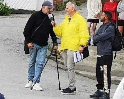 Bildet over t.v. : Arrangementleder Jens Marius Hammen intervjuer ildsjelen Hans Petter Schjelderup før starten av programmet. Til høyre for intervjueren sees en representant for arbeidet i Etiopia. Bildet over t.h.: Deltakere gjør seg klare til oppvarmingsøvelser før Walk & Run starter. Begge fotos: Inge O. Waage