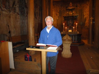 Olav Sem under sitt foredrag i Heddal Stavkirke etter pristildelingen. Foto: Inge O. Waage