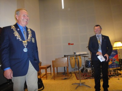 En god fornøyd Distriktsguvernør Bjørn Jahren Aas takker for seg , med en like fornøyd klubbpresident Tor Skovdal Friis i bakgrunnen. Foto: I.O. Waage