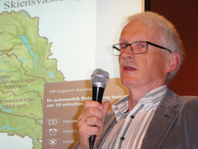 Direktør Nicolai Østhus under under hans foredrag. Til høyre: Skiensvassdraget.