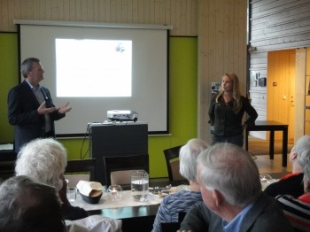 En lydhør forsamling, med Tor Skovdal Friis og Lene Friis i bakgrunnen. Foto: Inge O. Waage.